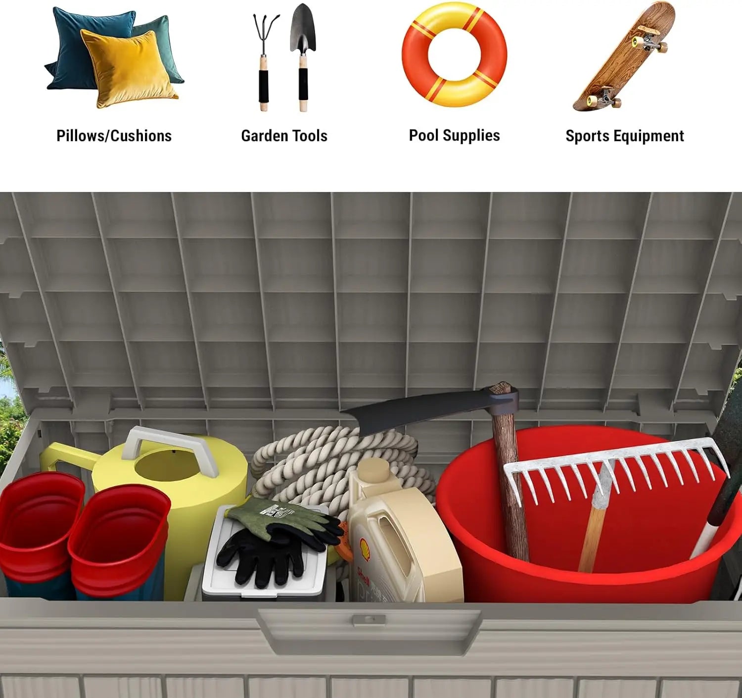 Keep your outdoor area tidy and organized. Ideal for storing patio cushions, pool accessories, gardening tools, or even securing porch deliveries. The box also doubles as a small side table, adding both function and style to your space.