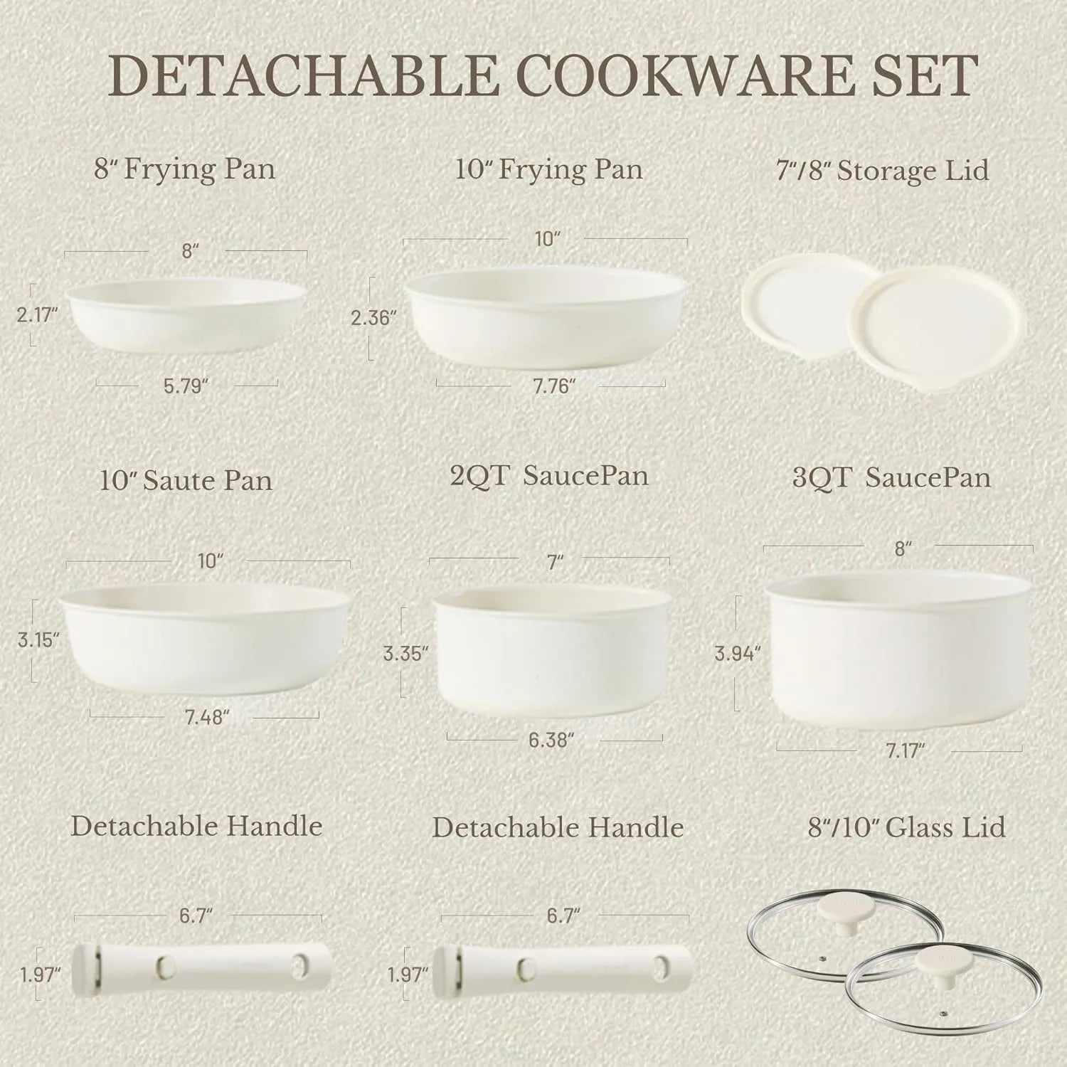 Detachable Handle Nonstick Frying Pan Set – Oven, Refrigerator Safe Cookware in Milky White