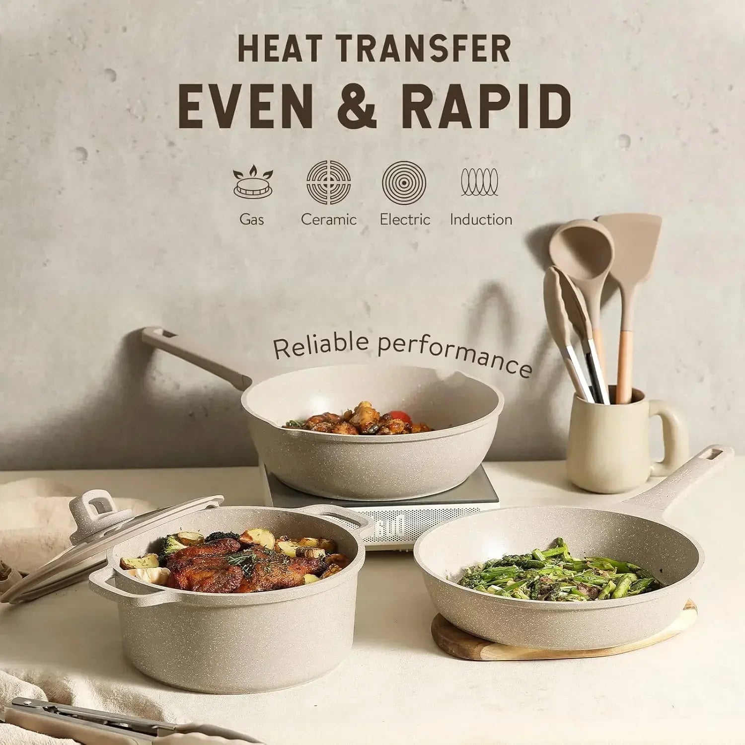 Built with a heavy-gauge base, this set works perfectly on induction, gas, electric, and ceramic stovetops. Sturdy yet lightweight for everyday use.